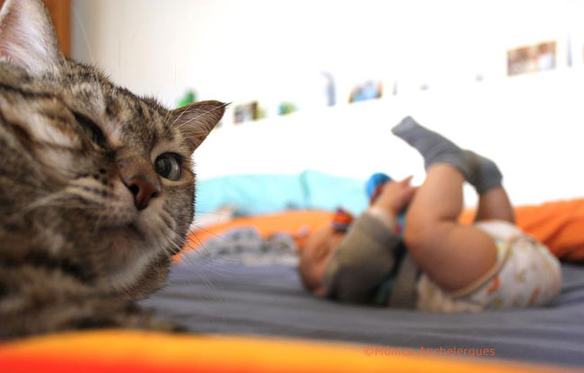 En el momento en que el gato llegue a esta conclusión va a aparecer el riesgo de celos, porque entra en competición directa con el niño. Luego nuestro objetivo será evitar que suceda esto. Lo normal es que cuando el bebé duerma los adultos estemos más tranquilas y le dediquemos más tiempo al animal y que cuando el crío esté despierto nos centremos en atender al niño. Nos parece totalmente lógico desde nuestro punto de vista humano, pero el gato no lo va a interpretar del mismo modo que nosotros y este puede ser un punto de desencuentro importante.