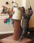 · La elección de los juguetes es algo que no debemos menospreciar. Hoy en día podemos encontrar numerosos juguetes especialmente pensados para nuestro gato. Los colores, las formas, los olores o sonidos los hacen tremendamente atractivos, pero hemos de recordar que están destinados a nuestro compañero y que ha de ser él el que dé el visto bueno al juguete. El objeto más caro y estrafalario de la tienda, ese que hemos adquirido con tanta ilusión, puede no ser del agrado de nuestro amigo. Para saber qué juguete es una buena elección hemos de tener en cuenta que este ha de asemejarse lo más posible a una presa. Además, si poseemos más de un ejemplar podremos observar que lo que le fascina a uno al otro no la causa la más mínima curiosidad, lo que nos despista aún más a la hora de elegir el juguete más apropiado.