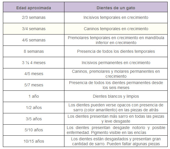 La siguiente tabla puede ayudarnos a calcular la edad aproximada del gato. A los cálculos generales que hagamos, debemos, por lo tanto, aplicar el baremo personal de la historia de nuestro gato para intentar personalizar, en la medida de lo posible, lo que hemos calculado.