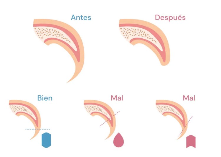 Presta mucha atención a la uña, observarás que se pueden distinguir dos partes. Una blanca y otra en tono rosado. Esta última es el rápido y contiene todos los vasos sanguíneos u nervios, por lo que nunca debes cortar la uña en esa zona. En caso de no estar segura del límite entre las dos zonas lo mejor es realizar un pequeño corte en la punta de la uña. Es preferible realizar esta operación más frecuentemente que lastimar a nuestro compañero.